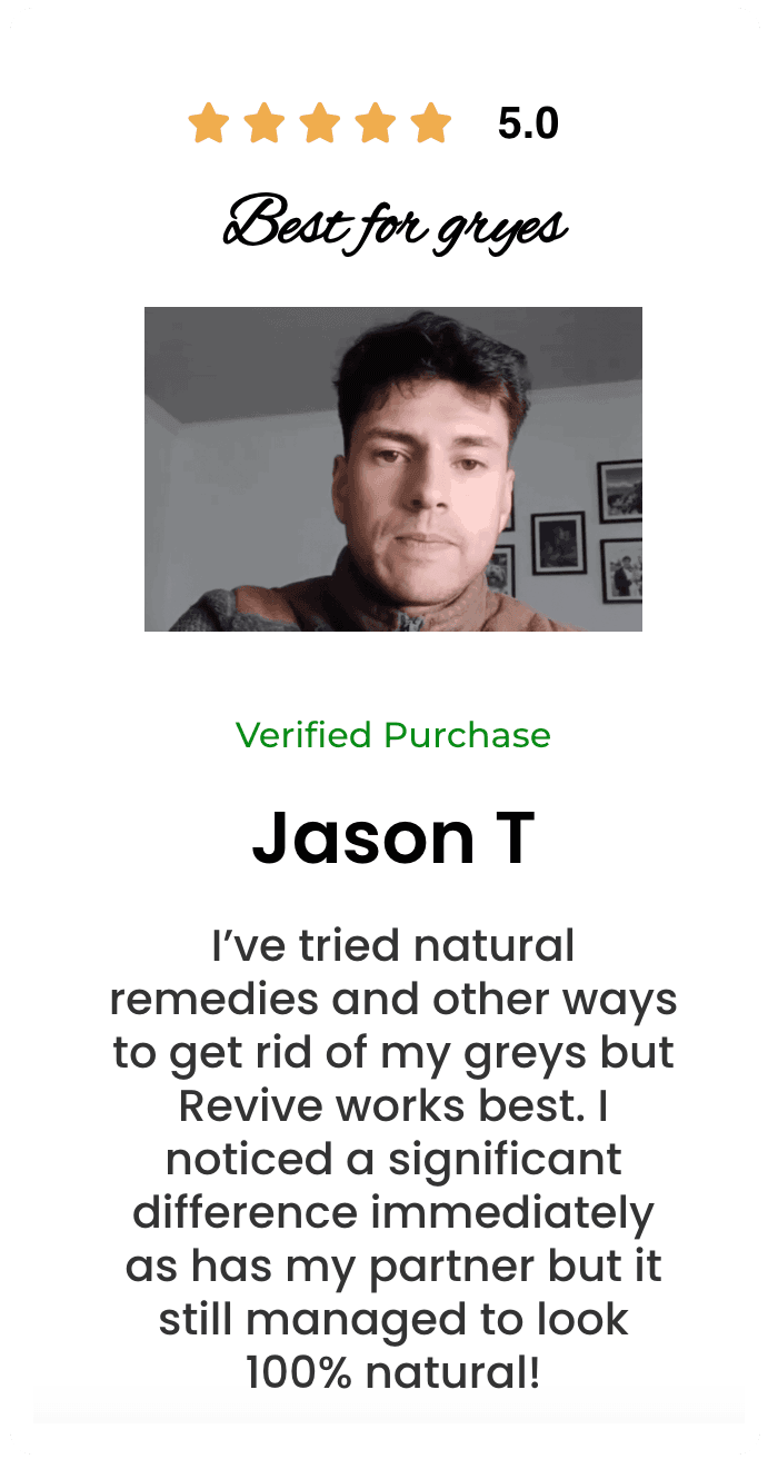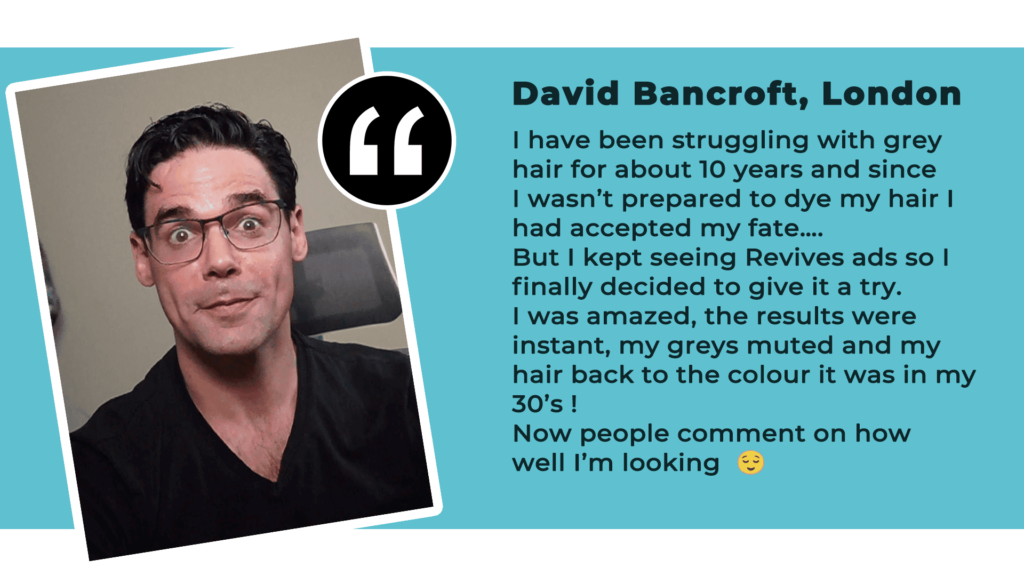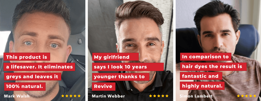 I can say hands down Revive is the best solution I’ve come across for greys. It’s much more natural than hair dyes and a lot easier to use. The results are fantastic and my girlfriend tells me I look 10 years younger !