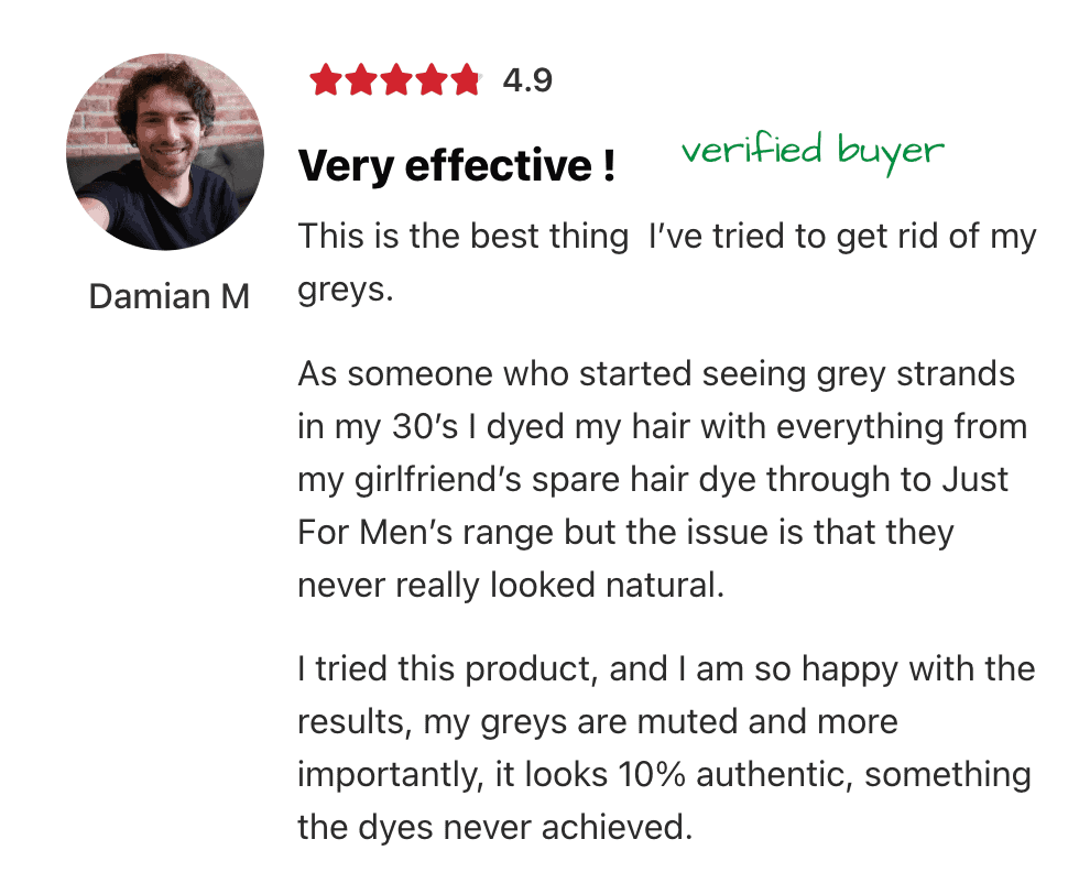 I’ve tried natural remedies, and other ways to get rid of my greys and this product works the best. noticed a significant difference as has my partner but it still managed to look 100% natural! Great product.